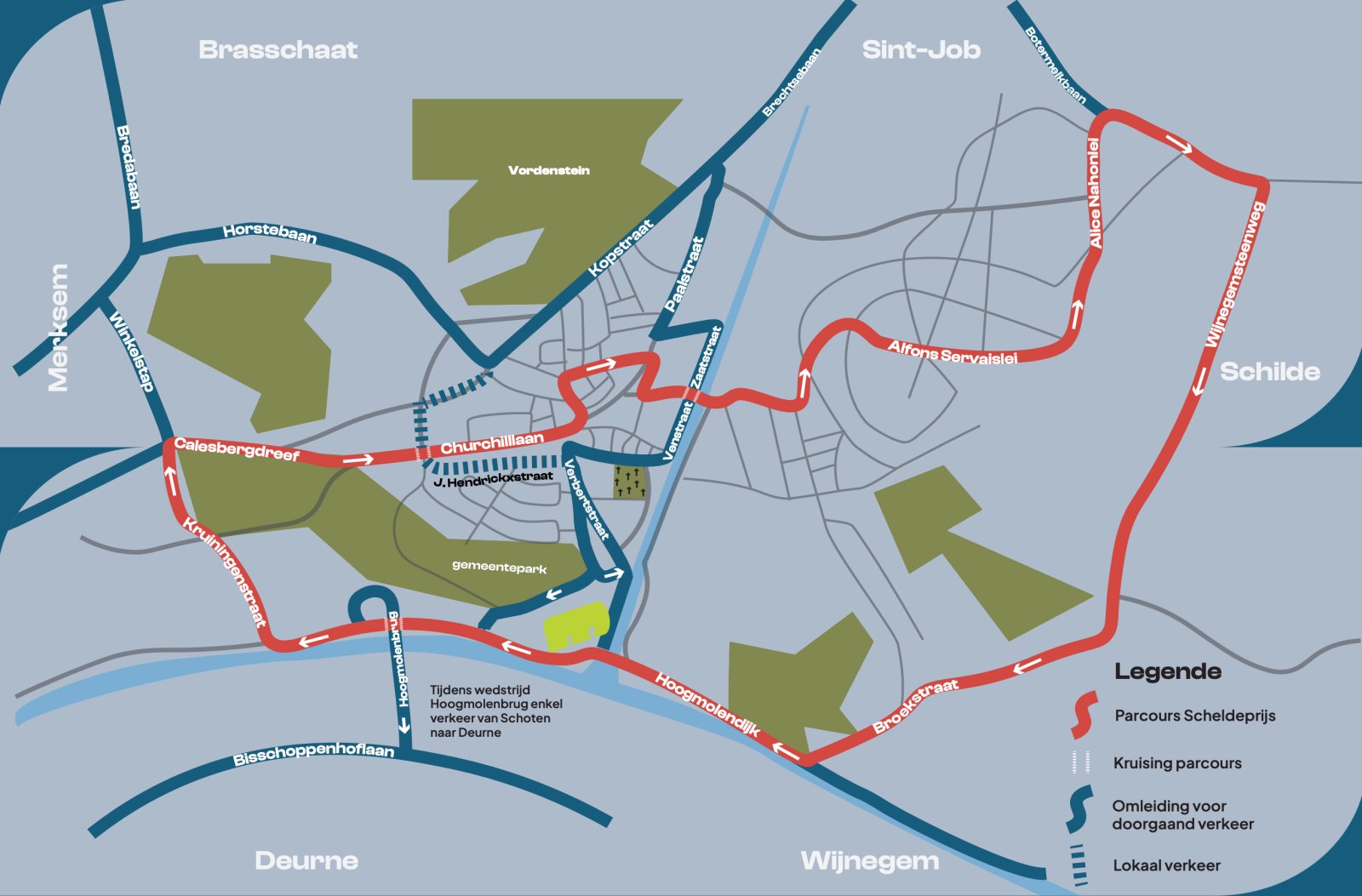 De hoogmolenbrug is tijdens de wedstrijd enkel open in de richting van Schoten naar Deurne.
